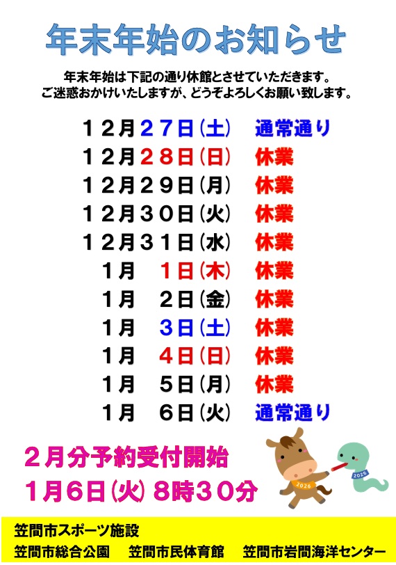 「笠間市総合公園」「笠間市民体育館」「笠間市岩間海洋センター」は、令和7年12月28日(日)から令和8年1月5日(月)の期間、休業させていただきます。