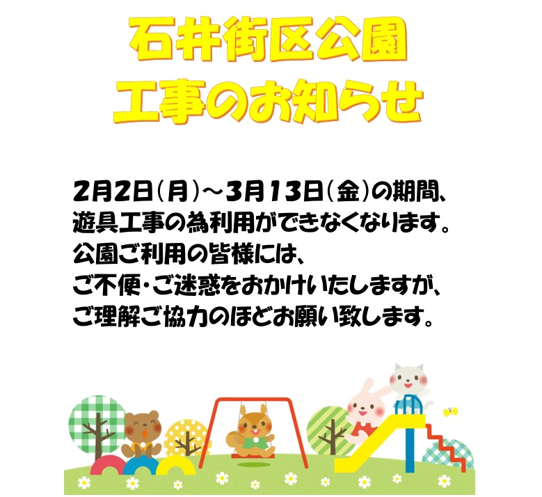 2月2日(月)~3月13日(金)の期間、遊具の工事があり、公園の利用が制限されてしまいます。